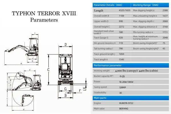 2025 4000 lb Typhon Terror XVIII Mini Excavator Rubber Track with Kubota D902 Diesel Engine Key Features